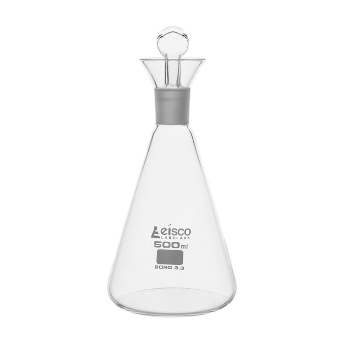 500ml capacity, iodine flask with ground joint and interchangeable stopper made of high quality, heavy duty 3.3 borosilicate glass. Used for iodine value determination. Ungraduated. Socket size 24/29. Flask measures 8" tall and has a base diameter of 4". Autoclavable, with superior chemical durability. Low temperature gradient- can withstand high temperatures & thermal shocks. Eisco Labs Borosilicate glass has the following heat tolerances: Strain Point 515°C | Annealing Point 565°C | Softening Point 820°C.