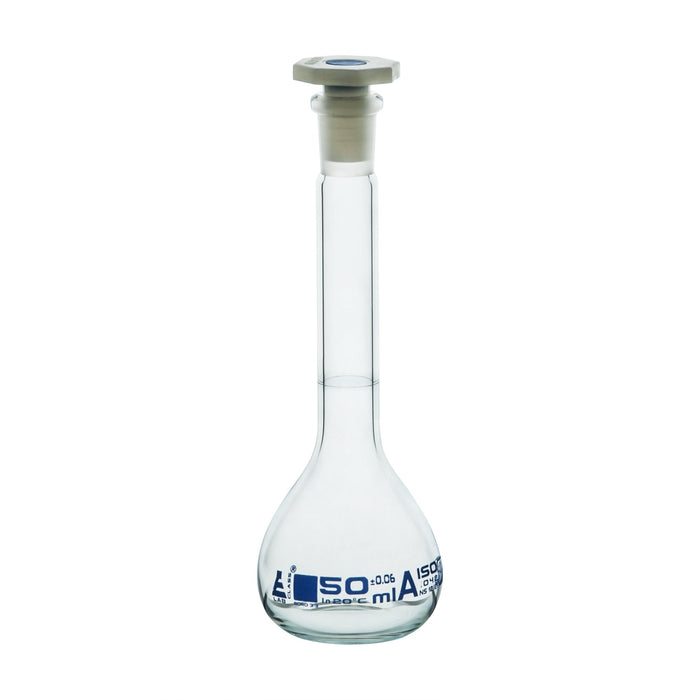 This 50ml capacity volumetric flask is made of high-quality, heavy-duty borosilicate 3.3 glass with a Class A tolerance of ±0.06ml. It features a single, white graduation mark and blue printed specifications. The flask comes fitted with a chemically resistant, interchangeable 12/21 polypropylene stopper. Standing 5" tall, it has a diameter of 1.9" at its widest point, with a neck measuring 0.65" in diameter and 2.75" in length. Autoclavable, this flask offers superior chemical durability and can withstand high temperatures and thermal shocks due to its low temperature gradient. Eisco Labs borosilicate glass has the following heat tolerances: Strain Point -515°C, Annealing Point 565°C, and Softening Point 820°C.