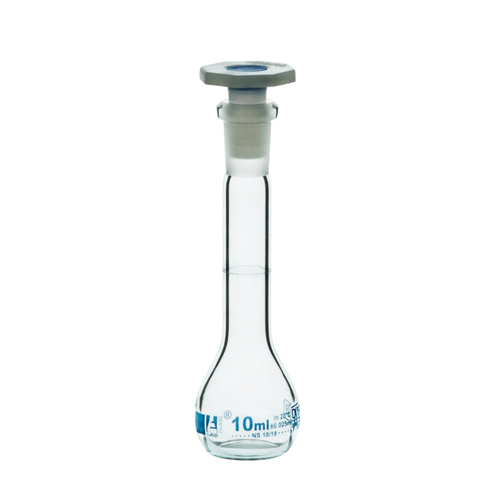 Volumetric flask made of Borosilicate 3.3 glass with single graduation mark. Fitted with chemical resistant polypropylene stopper. Class A tolerance, as per DIN ISO 1043 standard. Blue Graduation.Capacity: 10ml, Socket size 10/19, Tolerance ±0.025ml