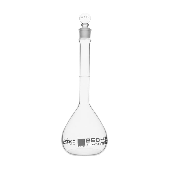250ml capacity volumetric flask made of high quality, heavy duty 3.3 borosilicate glass. Single, white graduation mark. Class B, tolerance ±0.24 ml. Fitted with a solid glass, 16mm stopper. Flask stands 8.5" tall, and has a bottom diameter of 3". Eisco Labs Borosilicate glass has the following heat tolerances: Strain Point -515°C | Annealing Point 565°C | Softening Point 820°C