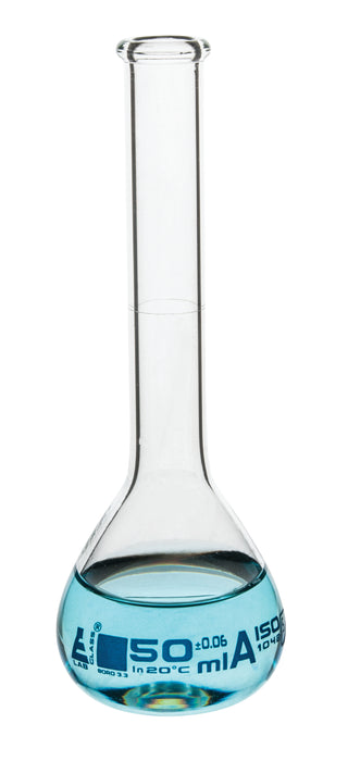 Flask Volumetric class 'A', cap. 50ml, borosilicate glass with rim without stopper, Each