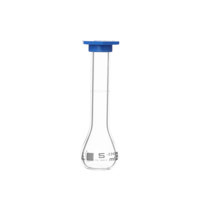 Volumetric Flask with a 5mL capacity is made of borosilicate 3.3 glass. It features a polyethylene snap cap. Class B with ±0.020mL tolerance, conforms with ASTM E-438 and E288 standards. Calibrated to contain.