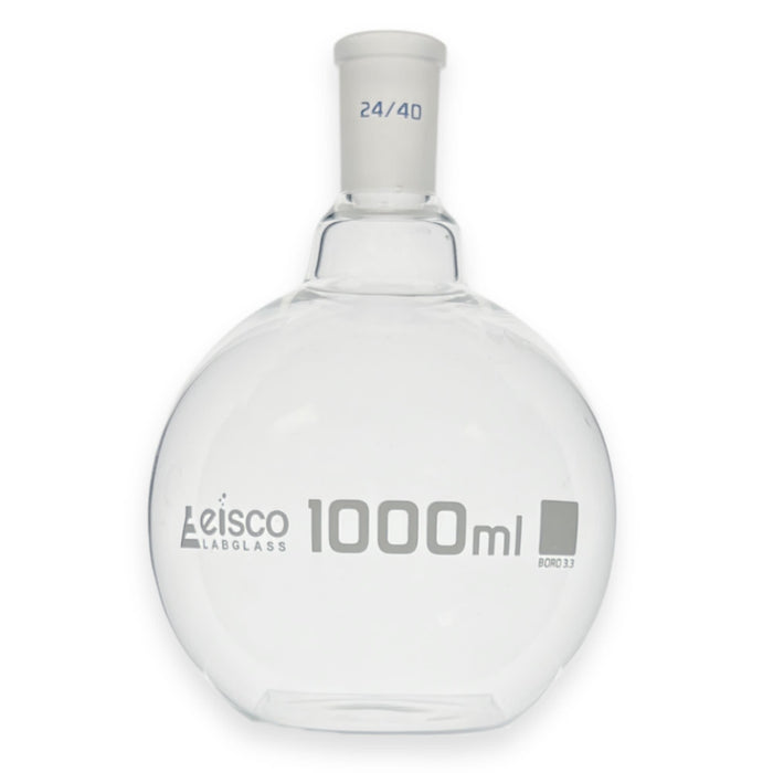 The Eisco Labs 1000 mL Flat Bottom Boiling Flask with a 24/40 ground joint is ideal for heating, boiling, distillations, and chemical synthesis in laboratory settings. Made from durable borosilicate glass, this flask withstands high temperatures and chemical exposure. Its flat bottom design provides stability on surfaces like hot plates, making it versatile for multiple lab applications. The standard 24/40 ground joint ensures easy connection to condensers and other lab apparatus. 3" flat base diameter5.25" bulb diameter7" height23mm inner diameter neck28mm outer diameter neck
