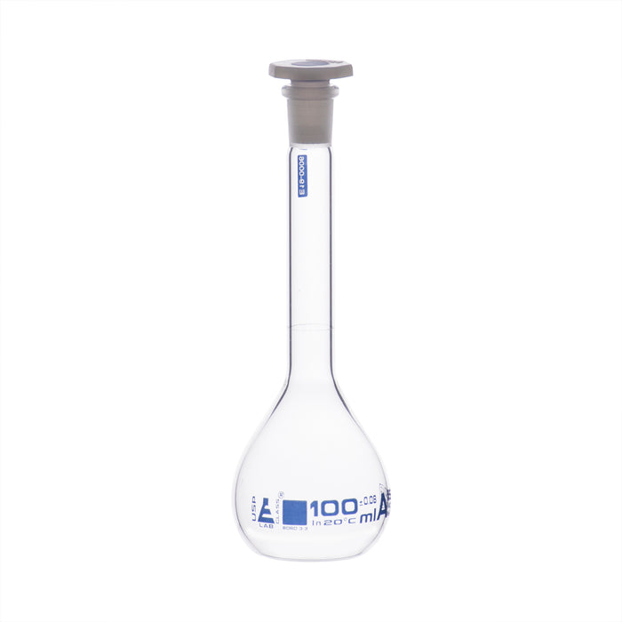Here is the corrected text: 100ml capacity volumetric flask made of high-quality, heavy-duty Borosilicate 3.3 glass with a single graduation mark. Fitted with a chemical- and heat-resistant 14/23 polypropylene cap, this Class A flask has a tolerance of ±0.08ml and is calibrated to contain. The flask stands 6.9 inches tall, with a bottom diameter of 2.25 inches and a neck diameter of 0.75 inches. Autoclavable and offering superior chemical durability, it features a low temperature gradient and can withstand high temperatures and thermal shocks. Eisco Labs Borosilicate glass has the following heat tolerances: strain point -515°C, annealing point 565°C, and softening point 820°C.