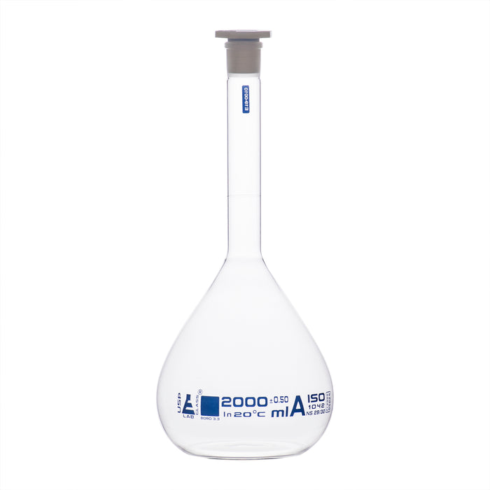 Volumetric flask made of Borosilicate 3.3 glass with single graduation mark. Fitted with chemical resistant 29/32 polypropylene stopper. Class A tolerance. Compliant with ASTM-E288 standards.Capacity: 2000mlCalibrated to contain.Eisco Labs proudly manufactures its own products using state-of-the-art equipment, and following the highest standards of quality control.Each product is carefully designed by a team of laboratory professionals and experienced engineers with quality and durability in mind. They are manufactured with only the highest grade, raw materials and according to international quality standards to ensure that they can withstand use in even the toughest laboratory environments.