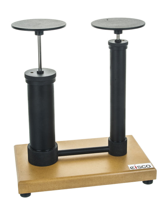 This Fluid Pressure Apparatus is perfect for the transmissibility of fluid pressure. Features two brass cylinders (19mm and 38mm diameter) fitted with pistons and connected by a brass tube. The pistons are fitted with circular discs for loading masses (masses not included). The apparatus is fixed to a sturdy molded plastic base with rubber stoppers underneath to prevent the apparatus from sliding or moving while in use. The apparatus is approximately 8" long, 5" wide, 9" tall, and weights 2.9 pounds.