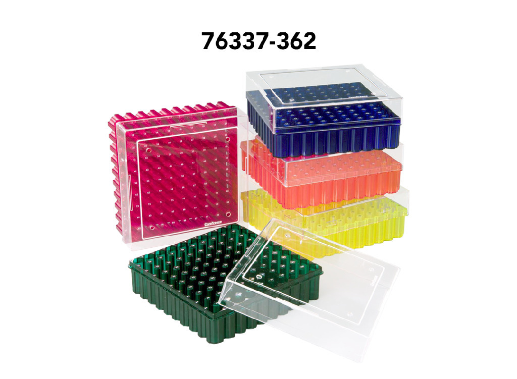These racks are ideal for long-term cryogenic storage., Maximum tube dimensions: | 12×49 mm tubes fit: 76337-368, 76337-366 and 76337-362 | 12×90 mm tubes fit: 76337-364, 02_BulletPoint: Drains and vents prevent pressure build-up | Crystal-clear lid provides sample visibility | Alphanumeric indexing for greater organization, Color: Assorted: blue, green, red, orange, yellow, Dimensions: 76×76×54 mm, Cat. No.: 76337-368, For tubes: 25×1.0/1.8 ml, Final SAP Desc Link: 6806928, SAP Description Status: Ready, These racks are ideal for long-term cryogenic storage., Maximum tube dimensions: | 12×49 mm tubes fit: 76337-368, 76337-366 and 76337-362 | 12×90 mm tubes fit: 76337-364, 02_BulletPoint: Drains and vents prevent pressure build-up | Crystal-clear lid provides sample visibility | Alphanumeric indexing for greater organization, Color: Assorted: blue, green, red, orange, yellow, Dimensions: 133×133×54 mm, Cat. No.: 76337-366, For tubes: 81×1.0/1.8 ml, Final SAP Desc Link: 6806928, SAP Description Status: Ready, These racks are ideal for long-term cryogenic storage., Maximum tube dimensions: | 12×49 mm tubes fit: 76337-368, 76337-366 and 76337-362 | 12×90 mm tubes fit: 76337-364, 02_BulletPoint: Drains and vents prevent pressure build-up | Crystal-clear lid provides sample visibility | Alphanumeric indexing for greater organization, Color: Assorted: blue, green, red, orange, yellow, Dimensions: 133×133×95 mm, Cat. No.: 76337-364, For tubes: 81×4.5 ml, Final SAP Desc Link: 6806928, SAP Description Status: Ready, These racks are ideal for long-term cryogenic storage., Maximum tube dimensions: | 12×49 mm tubes fit: 76337-368, 76337-366 and 76337-362 | 12×90 mm tubes fit: 76337-364, 02_BulletPoint: Drains and vents prevent pressure build-up | Crystal-clear lid provides sample visibility | Alphanumeric indexing for greater organization, Final SAP Desc Link: 6806928, SAP Description Status: Ready, These racks are ideal for long-term cryogenic storage., Maximum tube dimensions: | 12×49 mm tubes fit: 76337-368, 76337-366 and 76337-362 | 12×90 mm tubes fit: 76337-364, 02_BulletPoint: Drains and vents prevent pressure build-up | Crystal-clear lid provides sample visibility | Alphanumeric indexing for greater organization, Color: Assorted: blue, green, red, orange, yellow, Dimensions: 133×133×54 mm, Cat. No.: 76337-362, For tubes: 100 1.0/1.8 ml, Final SAP Desc Link: 6806928, SAP Description Status: Ready