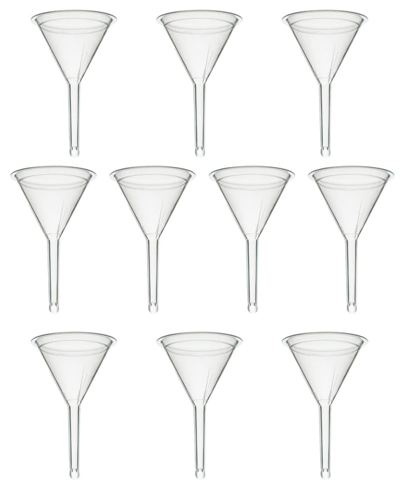 Pack of ten industrial-quality filter funnels made of polypropylene plastic. Excellent for separating solids from liquids as well as for easier transfers of liquids to narrow-mouthed containers. Each funnel measures 3.7 inches in total length and 2 inches in diameter. The stem is 1.9 inches long and has an outer diameter measuring 6.5 mm. Designed for use in professional laboratories, but it's also an ideal choice for science classrooms and household use. Eisco Labs proudly manufactures its own products using state-of-the-art equipment and follows the highest standards of quality control. Each product is carefully designed by a team of laboratory professionals and experienced engineers with quality and durability in mind. They are manufactured with only the highest-grade raw materials, according to international quality standards, to ensure that they can withstand use in even the toughest laboratory environments.