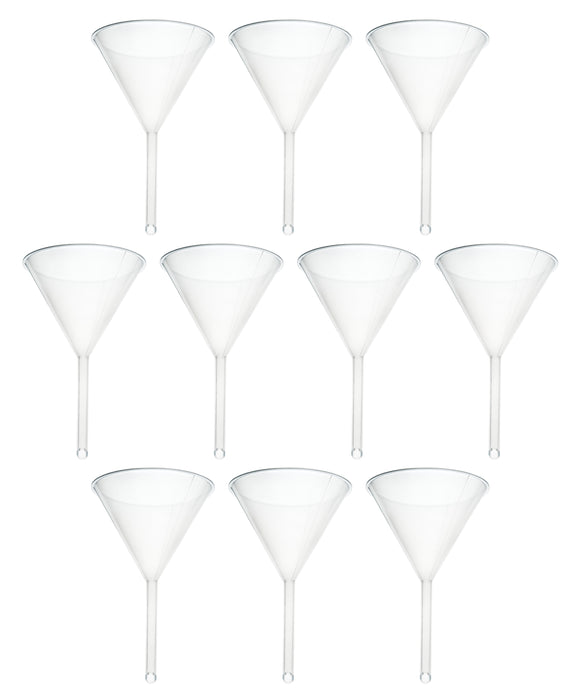 Here is the corrected text: Pack of ten industrial-quality filter funnels made of polypropylene plastic. Excellent for separating solids from liquids, as well as for easier transfers of liquids to narrow-mouthed containers. Each funnel measures 6.3 inches in total length and 3.6 inches in diameter. The stem is 3.2 inches long and has an outer diameter measuring 9mm. Designed for use in professional laboratories, but it's also an ideal choice for science classrooms and household use. Eisco Labs proudly manufactures its own products using state-of-the-art equipment and follows the highest standards of quality control. Each product is carefully designed by a team of laboratory professionals and experienced engineers with quality and durability in mind. They are manufactured with only the highest-grade raw materials, according to international quality standards, to ensure that they can withstand use in even the toughest laboratory environments.