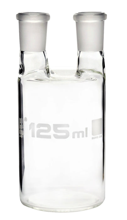 Here is the corrected text: The Woulff Gas Wash Bottle is made from high-quality, heavy-duty borosilicate glass and has a 125ml capacity. This gas washing bottle features two necks with 14/23 sockets, allowing for easy sealing and exchange. It can be used to remove impurities from gases. The bottle measures 2" in diameter and 5" in overall height, with each neck measuring 1.5" long and 0.75" in diameter. Autoclavable and featuring superior chemical durability, this bottle has a low temperature gradient and can withstand high temperatures and thermal shocks. Eisco Labs' borosilicate glass has the following heat tolerances: strain point of 515°C, annealing point of 565°C, and softening point of 820°C.