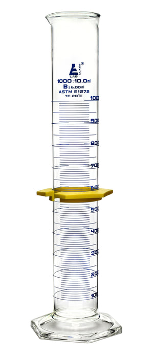 Here is the corrected text: This measuring cylinder has a capacity of 1000ml and is made from high-quality, heavy-duty Borosilicate 3.3 glass. It features a spout for easy pouring and a hexagonal base for extra stability. With a Class B tolerance of ±6.00ml as per ISO/ASTM standards, it is fitted with a plastic, hexagonal protective collar. The cylinder stands 18 inches tall, with a base measuring 5 inches wide. The inner diameter of the cylinder body measures 2.5 inches, and the outer diameter measures 2.8 inches. Autoclavable and offering superior chemical durability, this cylinder can withstand high temperatures and thermal shocks due to its low temperature gradient. Eisco Labs Borosilicate glass has the following heat tolerances: strain point of 515°C, annealing point of 565°C, and softening point of 820°C.