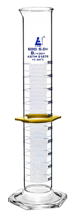 500ml capacity measuring cylinder made of high quality, heavy duty Borosilicate 3.3 glass. Hexagonal base for extra stability. Class B tolerance, ±4.00ml as per ISO/ASTM. Fitted with a plastic, hexagonal protective collar.Cylinder stands 14.25" tall, with a base measuring 4.5" wide. Inner diameter of cylinder body measures 2", and outer diameter measures 2.2".Autoclavable, with superior chemical durability. Low temperature gradient- can withstand high temperatures & thermal shocks. Eisco Labs Borosilicate glass has the following heat tolerances: Strain Point -515°C | Annealing Point 565°C | Softening Point 820°C.