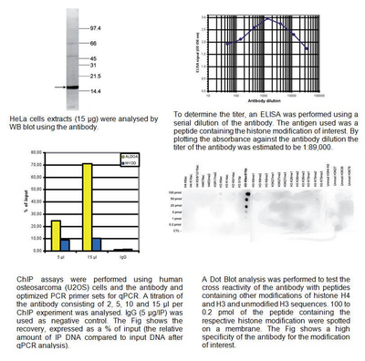 H3K9acS10p Antibody, 50 ul^ H3K9acS10p, Polyclonal Antibody, Host: Rabbit, Isotype: IgG, Species reactivity: Human, Immunogen: KLH-conjugated synthetic peptide of Histone H3 containing acetylated lysine 9 and the phosphorylated serine 10, Application: WB, IF, ELISA, Dot blot analysis, Size: 50 ul