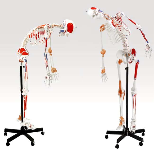 keleton, wheeled base stand, manual A life-size model of a human skeleton provides an incredible realism and detail for students. Pinned joints allow for the demonstration of limb movements. The skeleton is made of a fibrous material, finished in natural colors and mounted on a stand. Life sized model measuring 62 in. Articulated joints allow for movement Pelvic mounted on rod with wheeled base Skull opens for detailed structural analysis Left side hand painted by artisan to show muscular points of origin in red and points of insertion in blue, each numbered for your convenience along with ligament