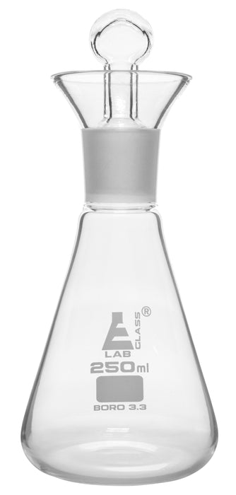 250ml capacity, iodine flask with ground joint and interchangeable stopper made of high quality, heavy duty 3.3 borosilicate glass. Used for iodine value determination. Ungraduated. Socket size 29/32. Flask measures 6.25" tall and has a base diameter of 3.25". Eisco Labs Borosilicate glass has the following heat tolerances: Strain Point -515°C | Annealing Point 565°C | Softening Point 820°C.