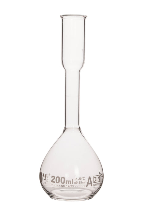 Made of borosilicate glass with one graduation mark. Capacity 200 ml, Tolerance ±0.10 ml