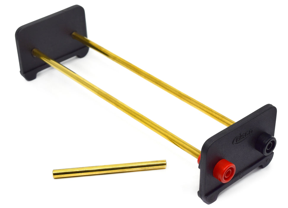 Current required for movement is approximately 3 Amp. Apparatus fitted with 4mm sockets. For demonstrating the action of magnetic field on free moving current carrying conductor placed on to current elements. Calculation is done resulting from the displacement of the conductor due to electromagnetic force. W = B.I.I.D = If. Apparatus measures 11.75" long, 3" wide and 2" tall. Carrying conductor pieces measures 3" long and 0.25" in diameter.