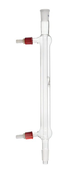 Liebig Condenser made of high quality, heavy duty Borosilicate glass. Condenser is equipped with plastic, threaded connectors on each side arm. 19/26 socket size and cone. Condenser measures 14.75" in length and is 1" in diameter. Autoclavable, with superior chemical durability. Low temperature gradient- can withstand high temperatures & thermal shocks. Eisco Labs Borosilicate glass has the following heat tolerances: Strain Point -515°C | Annealing Point 565°C | Softening Point 820°C.