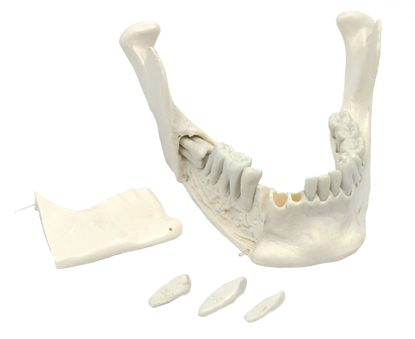 Lower jaw model, with 16 extractable teeth. Partial section of the jaw can be removed for further study. This anatomically correct model provides an incredible amount of realism and detail for examining the human skeleton. Features realistic textures and bony landmarks, making it an excellent tool for educational study, as well as for patient demonstrations. Can be used for individual study or as replacement for missing or damaged pieces to a full skeletal model set. Made of durable, sturdy and washable PVC plastic, these model bones will withstand long time use and handling.