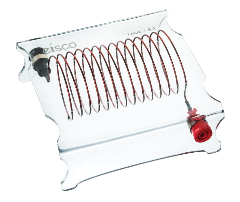 Mounted on an acrylic sheet with socket connections, this solenoid features multi-loops of 1.5mm diameter copper wire, ideal for investigating the magnetic field associated with a solenoid coil. The coil measures 51 x 92 mm in diameter and length.
