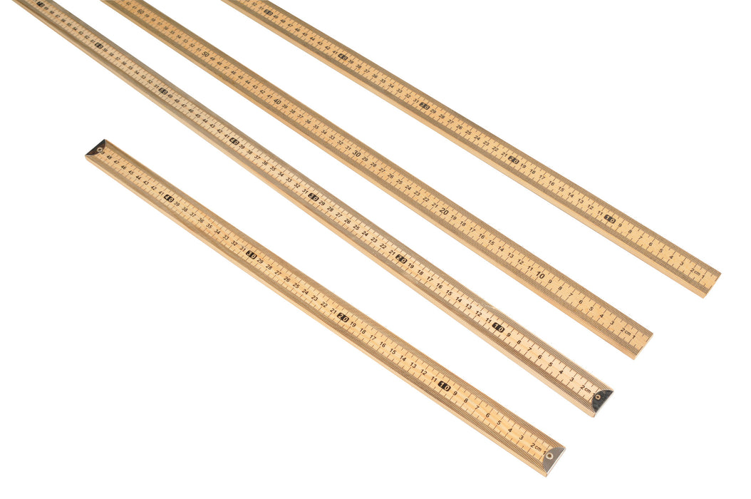 Made from hardwood, this ruler features graduations on both edges in centimeters and millimeters, with a one-meter length, and offers vertical reading with a zero starting point at the top.