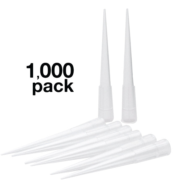 Pack of 1,000 non-sterile, autoclavable micropipette tips, free of lubricants, dyes, and heavy metals, with a capacity range of 2.0 to 200 µl. Each micropipette tip measures 2 inches long.