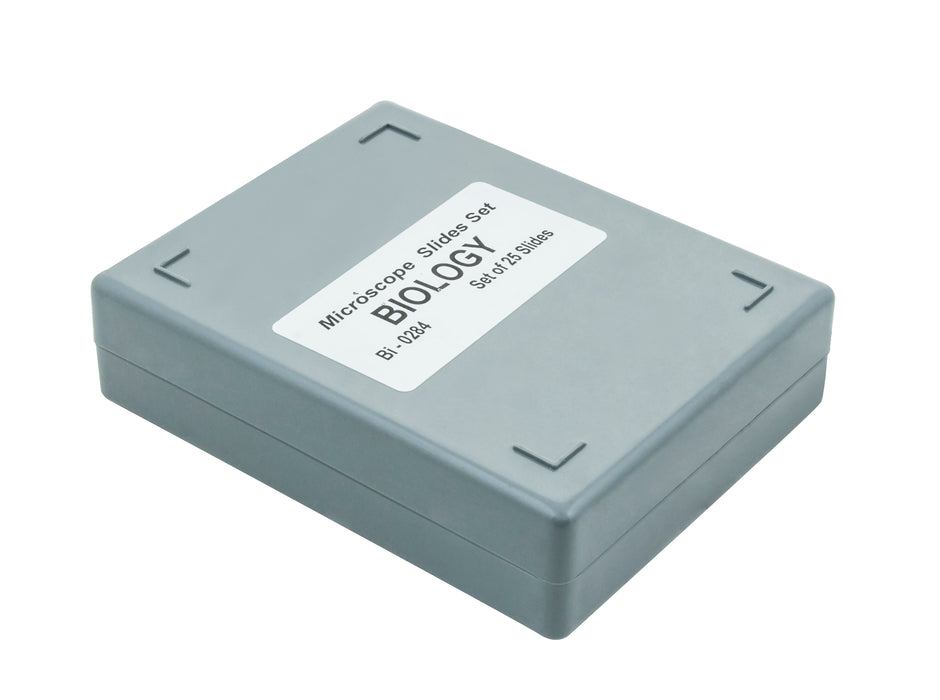 This set covers the major requirements for a basic biology course, featuring selected slides from zoology, histology, and botany sections. Supplied in a box, this useful set includes: Paramecium; E Paramecium conjugation; E Hydra; TS Hydra with testis; TS Hydra with ovary; TS Taenia (tapeworm) scolex; LS Taenia proglottid; E Compact bone; TS Striated muscle; LS Cardiac muscle; LS Spinal cord; TS Nerve cells smear; Skin VS; Kidney VS; Lycopodium strobilus LS; Spirogyra conjugation; Yeast E; Lilium (lily) anther; TS Dryopteris pinnule with sori; TS Stigma with pollen tube Lilium (lily) anther; TS Dryopteris pinnule with sori; TS Stigma with pollen tube Cucurbita (marrow) stem; TS Lilium ovary; TS Tilia (lima) young and old stem; TS Lumbricus (earthworm) typhlosole; Helianthus stem secondary thickening; TS.