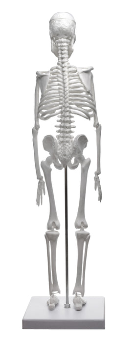 ull; MINIATURE || 18" tall anatomically correct tan/yellow colored human skeleton model • MOVABLE || Made of non-toxic PVC material designed to be easy to clean and use - Equipped with movable jaw, knees, ankles, elbows, wrists, and shoulders • PERFECT FOR TEACHING AND STUDYING || Features realistic movement for study and interaction - Skull cap is detachable to allow for greater visibility - Arms and legs are attached by threaded studs with nuts • MOUNTED || Mounted on a sturdy base allowing for closer examination of all sides • GREAT FOR DECORATION || Also great as a decorative piece in any haunting room