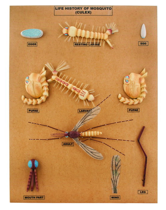 This 3-dimensional teaching demonstration model features a lifelike design, built from a custom mold, showcasing the various phases of mosquito (Culex) development. Made from durable polyvinyl chloride (PVC) plastic, it is mounted onto a backboard for longevity. The set comprises 10 models, illustrating the development of a mosquito from egg to adult. Each model is labeled for easy reference with the included key card. Hand-painted using vibrant, eco-friendly paint, this model is perfect for classroom demonstrations and has been designed by subject matter experts. A set of 10 models is mounted on a base, depicting the life history of the mosquito (Culex) in different stages, from its initial stage to complete development. The stages on the model are numbered and identified with the included key card. The size of this model is 23.5"L x 17.7"W x 3.1"D.