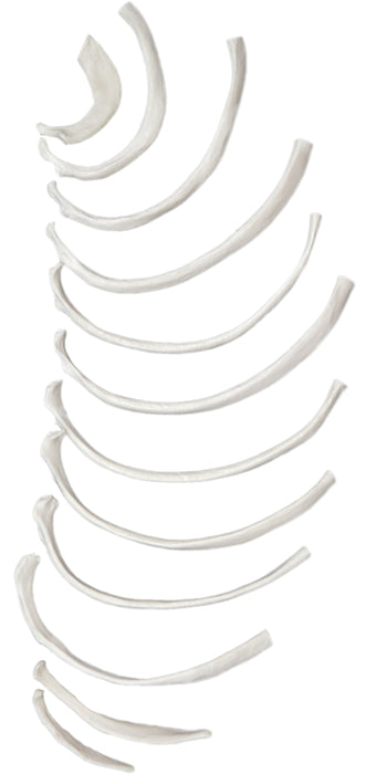 The life-size, disarticulated model of human rib bones provides an incredible amount of realism and detail for examining the human skeleton. Each bone features realistic textures and bony landmarks, making it an excellent tool for educational study, as well as for patient demonstrations. Can be used for individual study or as replacement for missing or damaged pieces to a full skeletal model set. Made of durable, sturdy and washable PVC plastic, these model bones will withstand long time use and handling. This set includes 12 bones, which are marked for easy demonstration. Half set of rib cage bones.