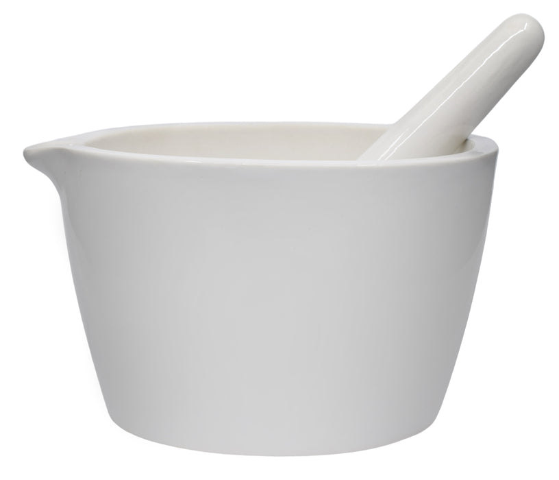 Single, heavy duty Mortar and Pestle set with a 64oz (1900ml) capacity. Perfect for grinding and crushing powders, pills, pigments and more. High walls prevent material from spilling out while being crushed. Mortar and pestle are both made of solid porcelain. Resistant to chips and cracks. Inside grinding surface of mortar and the rounded end of the pestle are unglazed for precise grinding and crushing. Mortar features a contoured spout for pouring and transferring of crushed material. Mortar measures 8.4" wide and 5.4" tall. Pestle measures 9" in length and the rounded end measures 2" in diameter.