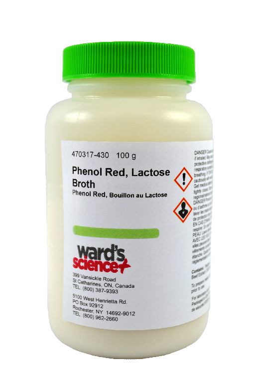 A basal medium containing a single carbohydrate used to determine whether bacteria can ferment the specific carbohydrate. The medium contains a pH indicator that changes from red to yellow if the bacteria can ferment the carbohydrate., To prepare media, add 20 g of phenol red lactose broth to a liter of distilled or de-ionized water. The media will not be sterile until autoclaved prior to use., 02_BulletPoint: May be used with Durham tubes to determine if gas is produced during the fermentation process, A basal medium containing a single carbohydrate used to determine whether bacteria can ferment the specific carbohydrate. The medium contains a pH indicator that changes from red to yellow if the bacteria can ferment the carbohydrate., To prepare media, add 20 g of phenol red lactose broth to a liter of distilled or de-ionized water. The media will not be sterile until autoclaved prior to use., 02_BulletPoint: May be used with Durham tubes to determine if gas is produced during the fermentation process, Size: 100 g, Cat. No.: 470317-430, A basal medium containing a single carbohydrate used to determine whether bacteria can ferment the specific carbohydrate. The medium contains a pH indicator that changes from red to yellow if the bacteria can ferment the carbohydrate., To prepare media, add 20 g of phenol red lactose broth to a liter of distilled or de-ionized water. The media will not be sterile until autoclaved prior to use., 02_BulletPoint: May be used with Durham tubes to determine if gas is produced during the fermentation process, Size: 500 g, Cat. No.: 470317-432