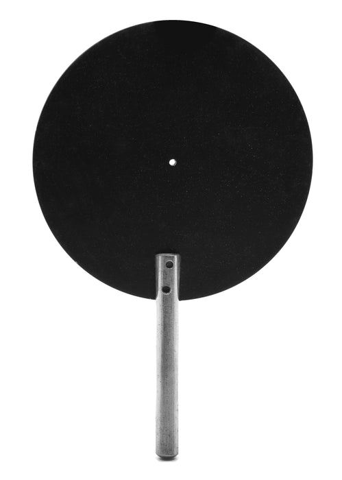 Black, circular pinhole screen. Screen measures 3" in diameter and is approximately 0.25" thick. Pinhole measures 0.06mm in diameter. Total length measures 4.6". Perfect tool for physics optics experimentation.