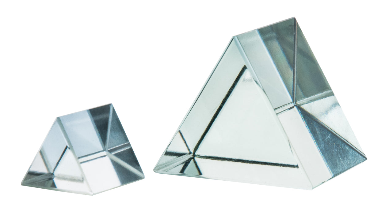 These glass prisms have non-optically worked surfaces with polished faces and slightly beveled edges. They feature nominal angles of 60° x 60° x 60° and a size of 25 mm.
