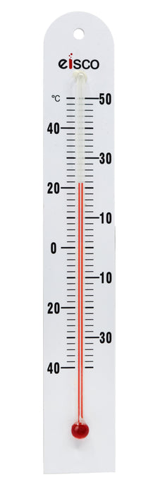 Spirit filled thermometer in glass with white PVC backing. Thermometer range is -40-50°C. 2°C graduations. 3.5mm hole located at the top for easy hanging. Perfect for any home or science laboratory. Thermometer measures 6.5" long and 1" wide.