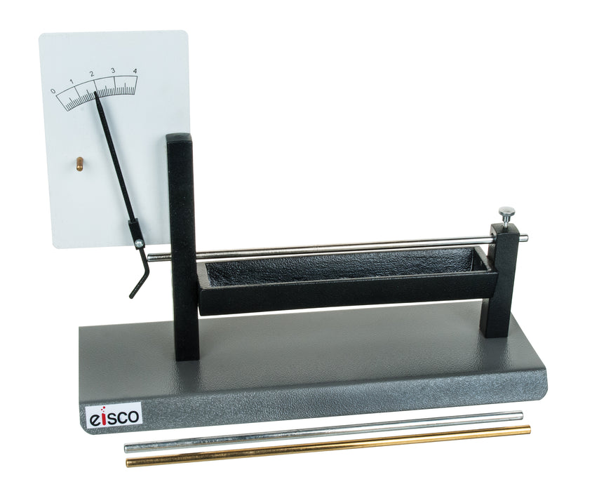 This Pyrometer apparatus is mounted on a metal base and features a large scale for easy view of expansion. Used to demonstrate linear expansion by heating. Includes 3 expansions bards (aluminum, brass, iron). Each rod is 10" long, 0.25" diameter. Apparatus is a total of 12" long, 5" wide, 9.5" tall.