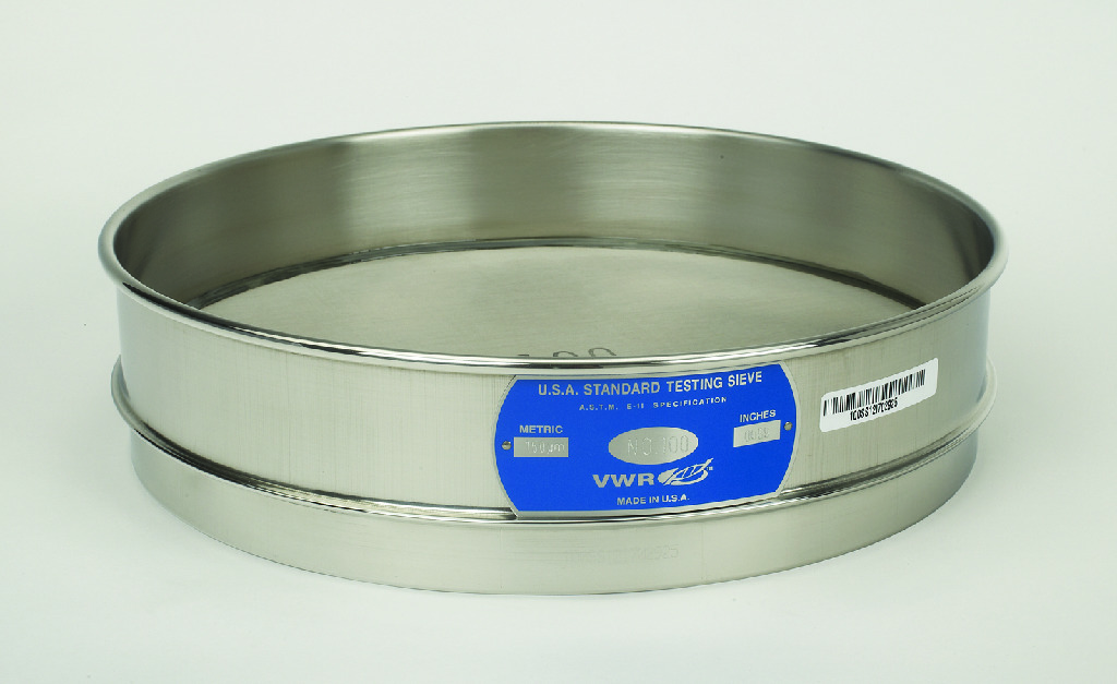 construction |, 08_Certifications: Each serialized sieves comes with a dated ASTM E11 Certificate of Compliance., 10_Ordering: Sieves are available in half height (1 | 5 | / | 8 | "), intermediate height (2") or full height (3 | 1 | / | 4 | "). Sieve height/depth is measured from the frame rim to the sieve cloth. Sieve Certification, Pans, and Covers must be ordered separately., SBE: Y, Cat. No.: 47730-554, Mesh size: 150 µm (0.0059"), Usa series: #100, Final SAP Desc Link: 7008581 | 7008581, SAP Description Status: Ready | Ready, VWR® 12" Diameter (304.8 mm ) all stainless steel test sieves are durable and ideal for sieving applications where a larger sample size is required., Each sieve bears a traceable serial number and comes with a certificate of compliance verifying the sieve was made in compliance to the current ASTM E11 and ISO 3310 specifications. Sieve pans, sieve covers, sieve brushes, and Centerline® sieve inspection or calibration certificates are available as accessories., 09_BodyTextAccessories: Pans are available in half height (1- | 5 | / | 8 | ") or full height (3 | 1 | / | 4 | ") formats, in brass or stainless steel. Pans with extended rims can be used for running multiple tests simultaneously. Sieve brushes are available in a variety of options, with brush head coarseness and handle design and construction being major decision factors., 02_BulletPoint: | Half Height (3 | 1 | / | 4 | ") sieves |