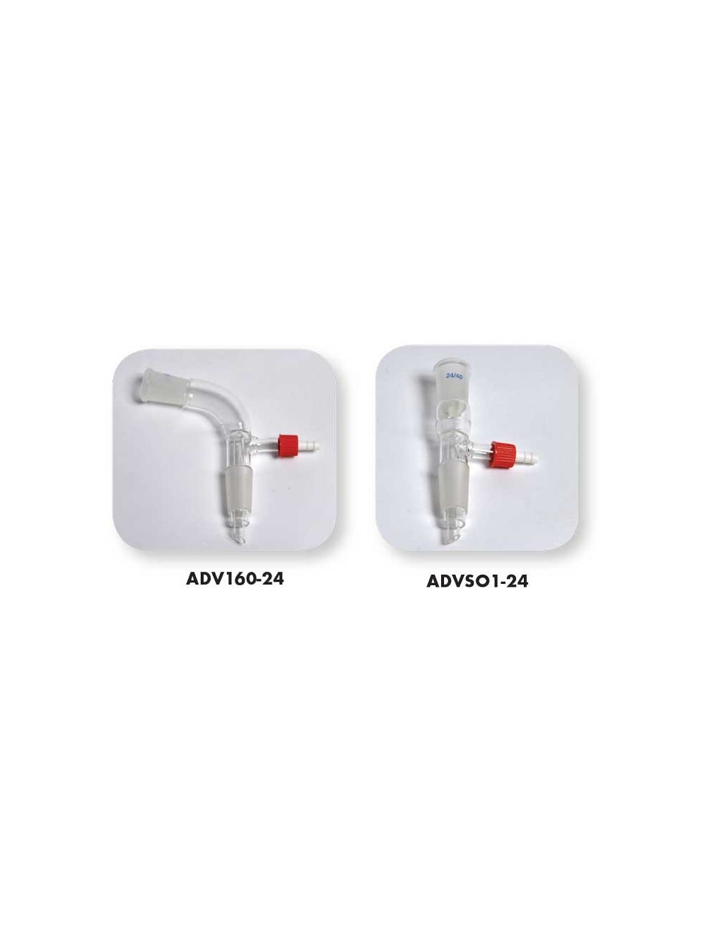 Vacuum adapters have 24/40 joints. Bent adapter has a 105° angle between the top outer joint and bottom inner joint. Straight adapter has a top outer joint and bottom inner joint. Both adapters have 24/40 joints and include a 3/8" hose connector.