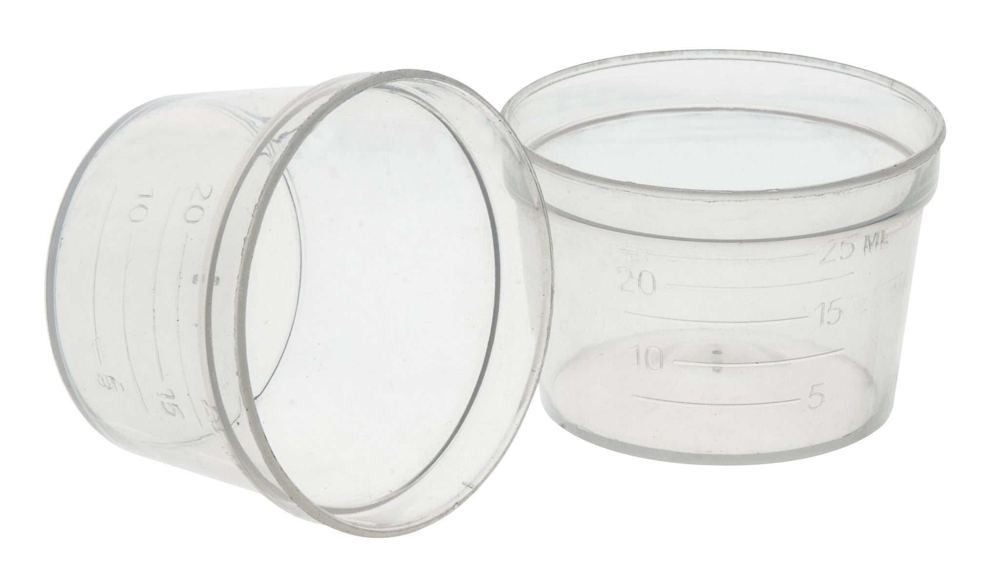 Small Graduated Cup - 25mL capacity, 5mL graduations, These transparent polypropylene cups can be used to measure different volumes up to 25mL., Pack of 250