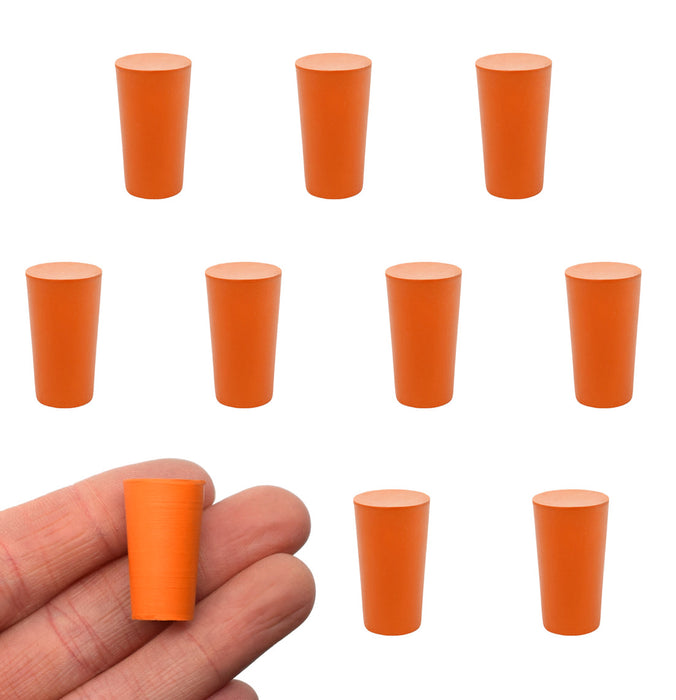 Pack of 10 stoppers, made from superior-quality solid rubber, features an orange color. Each stopper measures 20mm in length, with a base diameter of 9mm and a top diameter of 11.5mm. The durable rubber construction is suitable for use with chemicals, being resistant to acids, alkalis, and ammonia. Easy to clean, these stoppers are stable at temperatures between -20°C and 70°C. Designed for professional laboratory use, they are also perfect for various applications in the home and garage.