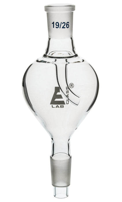 Splash Head made from high quality, heavy duty, 3.3 borosilicate glass. Vertical pear shape. Cone size 24/29. Socket size 19/26. Total length of 7". Eisco Labs Borosilicate glass has the following heat tolerances: Strain Point -515°C | Annealing Point 565°C | Softening Point 820°C.