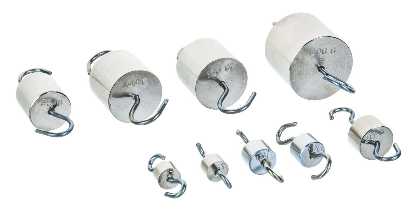 Here is a set of 10 steel weights, each featuring hooks on both sides, with the following capacities: 1 x 200g, 2 x 100g, 1 x 50g, 1 x 20g, 2 x 10g, and 2 x 5g.