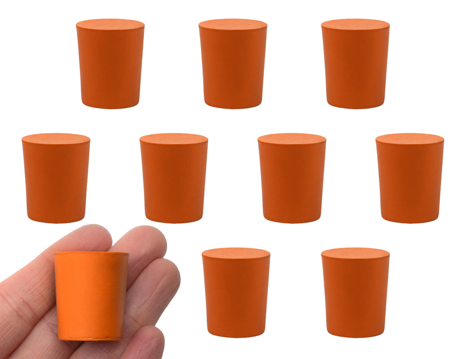 Here is the corrected text: Pack of 10 stoppers made from superior-quality, solid rubber in orange color. Each stopper measures 28mm in length, with a base diameter of 21mm and a top diameter of 24mm. The durable rubber construction is suitable for use with chemicals, resistant to acids, alkalis, and ammonia. Easy to clean, these stoppers are stable at temperatures between -20°C and 70°C. Designed for use in professional laboratories, they are also perfect for a variety of applications in the home and garage.