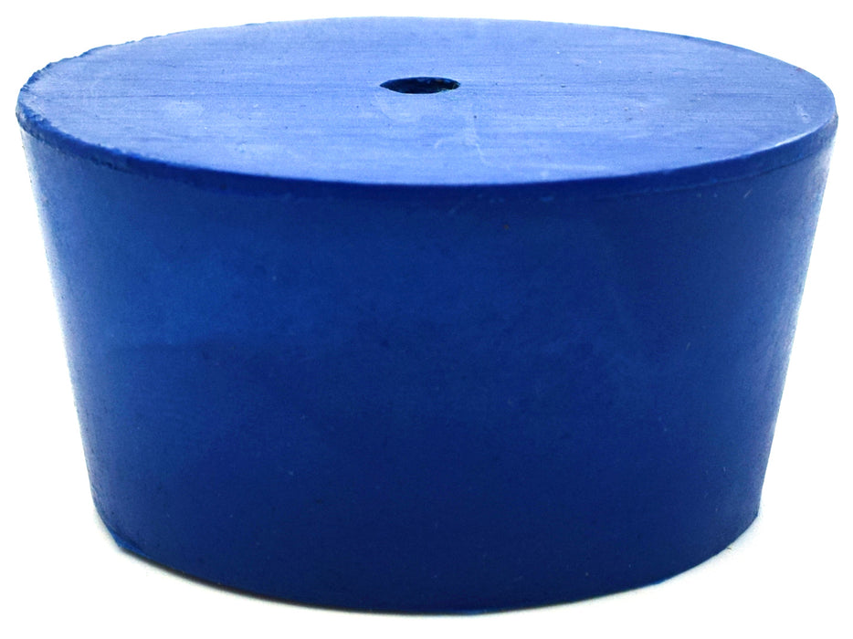 Pack of ten #10 stoppers made of long lasting neoprene rubber. Blue color. Each stopper features one hole measuring 5mm in diameter. Manufactured according to sizes recommended by ASTM standards. Each stopper measures 25mm in length, has a base diameter measuring 42mm, and a top diameter measuring 50mm. The neoprene rubber construction is suitable for use with petroleum products, minerals, oils and fats, as well as most inorganic acids and bases. Resistant to temperatures ranging from -40 to 130°C.