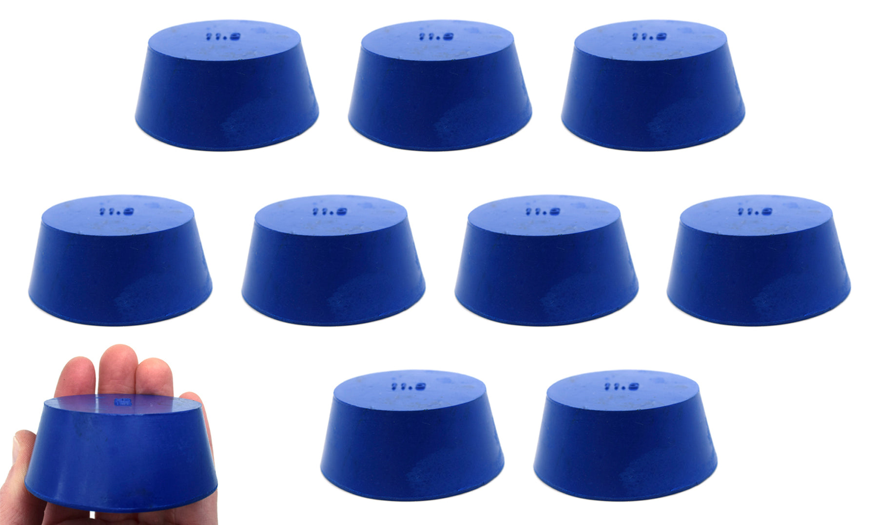 Pack of ten #11.5 stoppers made of solid, long lasting neoprene rubber. Blue color. Manufactured according to sizes recommended by ASTM standards. Each stopper measures 25mm in length, has a base diameter measuring 50mm, and a top diameter measuring 63mm. The neoprene rubber construction is suitable for use with petroleum products, minerals, oils and fats, as well as most inorganic acids and bases. Resistant to temperatures ranging from -40 to 130°C.