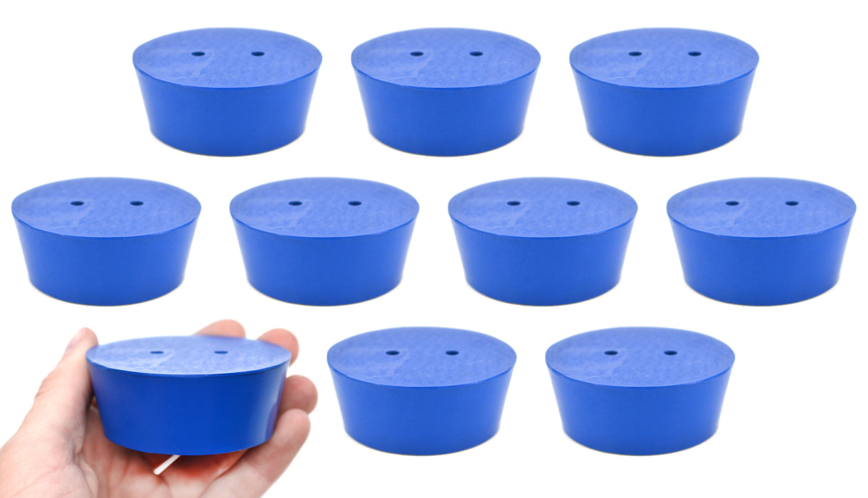 Pack of ten #12 stoppers made of long lasting neoprene rubber. Blue color. Each stopper features two holes measuring 5mm in diameter. Manufactured according to sizes recommended by ASTM standards. Each stopper measures 25mm in length, has a base diameter measuring 54mm, and a top diameter measuring 64mm. The neoprene rubber construction is suitable for use with petroleum products, minerals, oils and fats, as well as most inorganic acids and bases. Resistant to temperatures ranging from -40 to 130°C.
