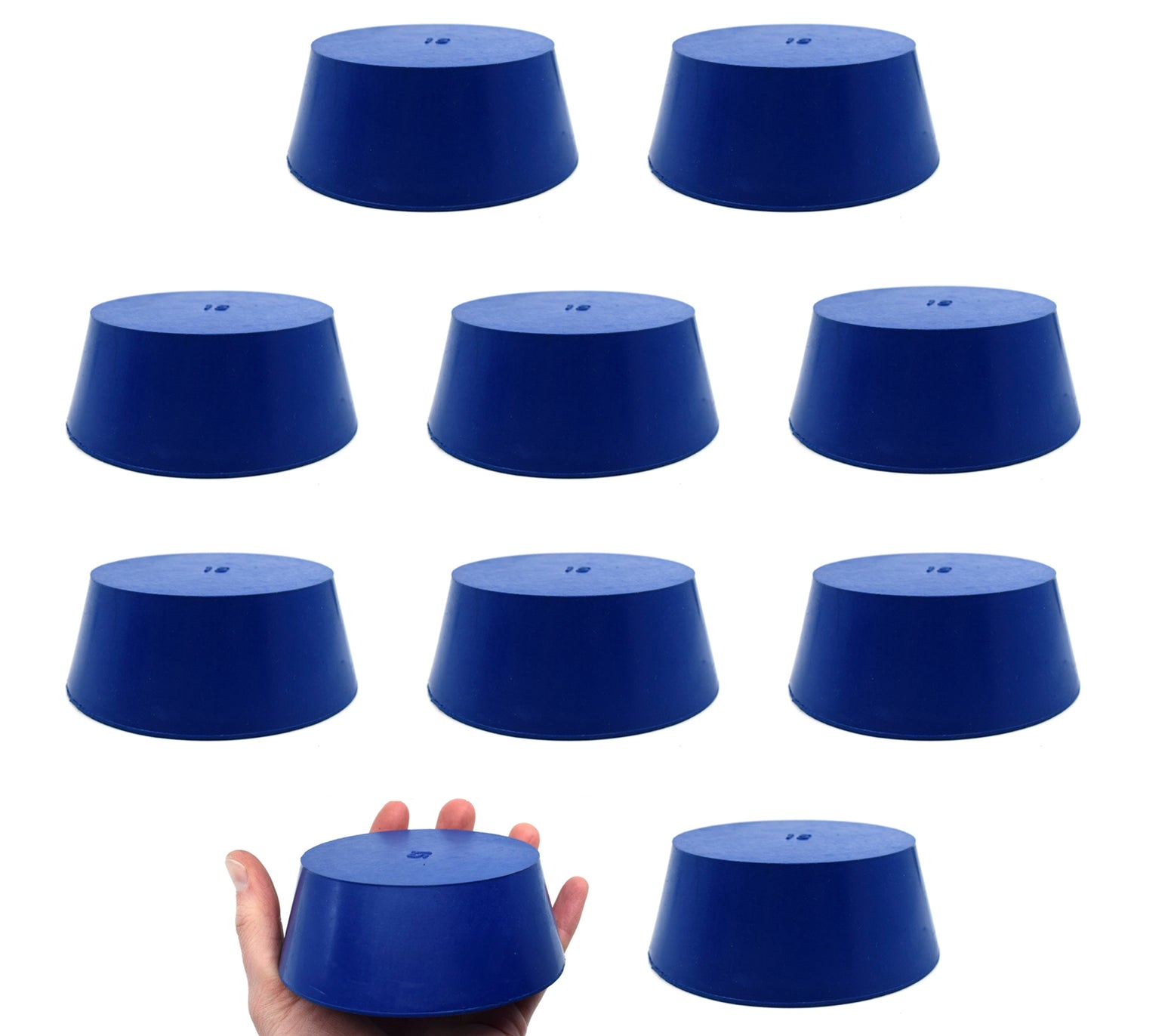 Pack of ten #15 stoppers made of solid, long lasting neoprene rubber. Blue color. Manufactured according to sizes recommended by ASTM standards. Each stopper measures 39mm in length, has a base diameter measuring 83mm, and a top diameter measuring 103mm. The neoprene rubber construction is suitable for use with petroleum products, minerals, oils and fats, as well as most inorganic acids and bases. Resistant to temperatures ranging from -40 to 130°C.