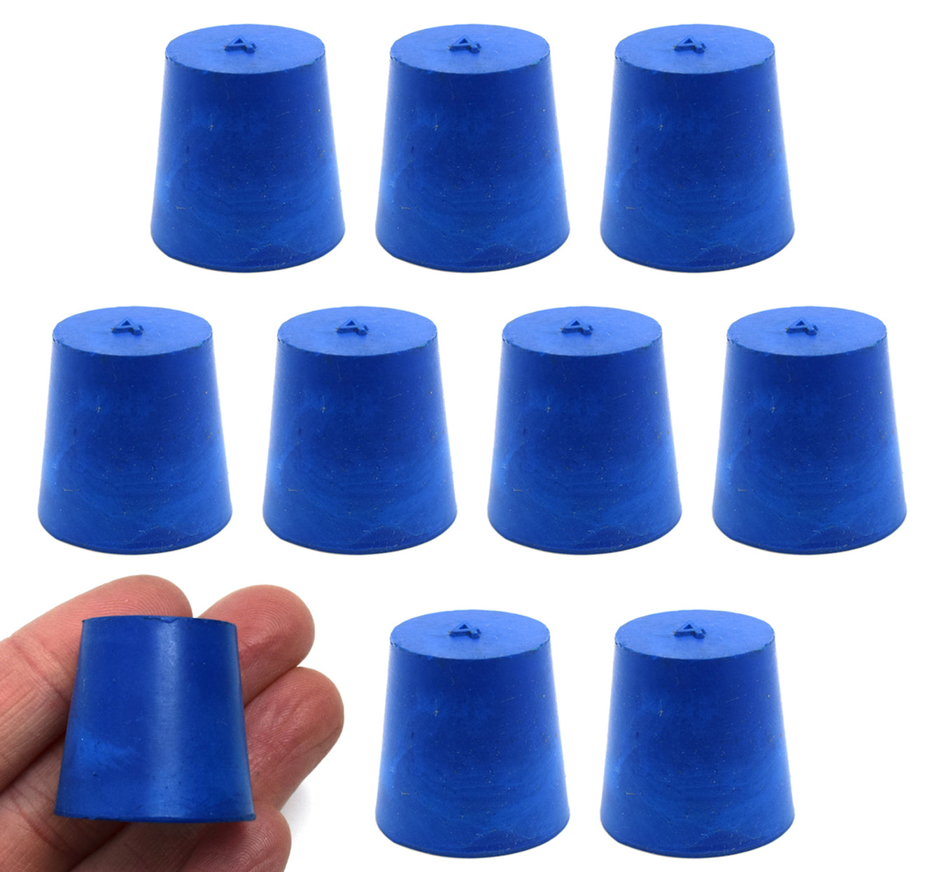 Pack of ten #4 stoppers made of solid, long lasting neoprene rubber. Blue color. Manufactured according to sizes recommended by ASTM standards. Each stopper measures 25mm in length, has a base diameter measuring 20mm, and a top diameter measuring 26mm. The neoprene rubber construction is suitable for use with petroleum products, minerals, oils and fats, as well as most inorganic acids and bases. Resistant to temperatures ranging from -40 to 130°C.