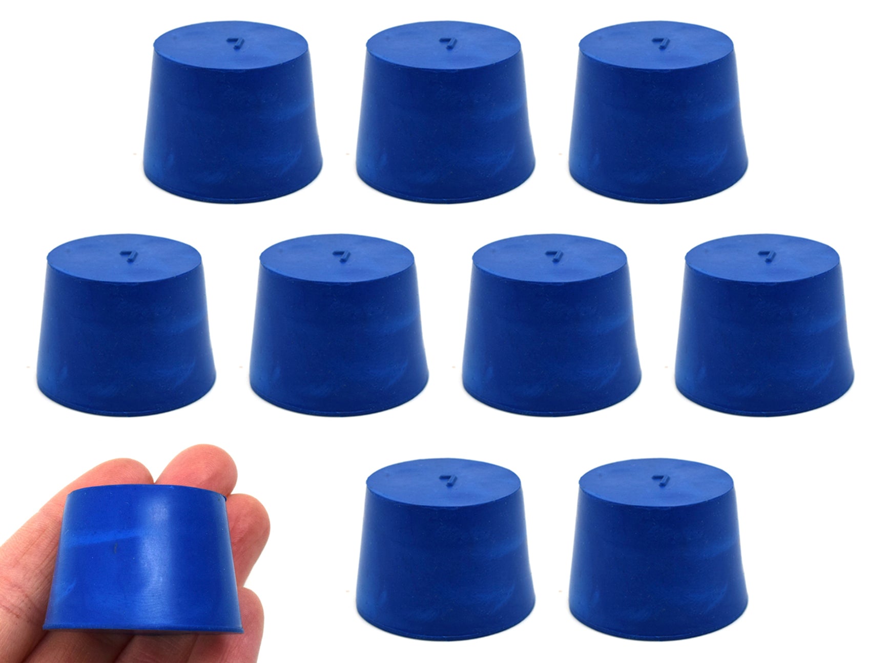 Pack of ten #7 stoppers made of solid, long lasting neoprene rubber. Blue color. Manufactured according to sizes recommended by ASTM standards. Each stopper measures 25mm in length, has a base diameter measuring 30mm, and a top diameter measuring 37mm. The neoprene rubber construction is suitable for use with petroleum products, minerals, oils and fats, as well as most inorganic acids and bases. Resistant to temperatures ranging from -40 to 130°C.