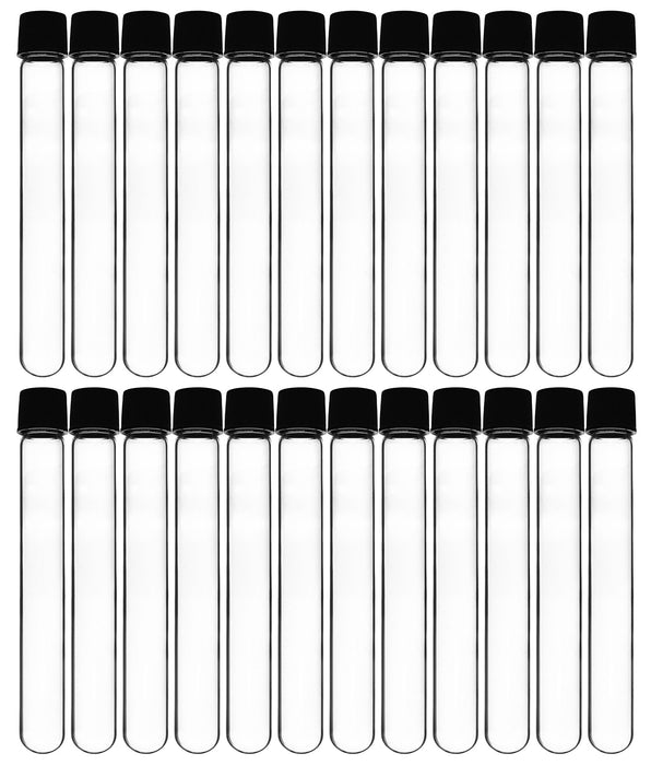 Pack of 24, round bottom culture tubes, each with a 25ml capacity. Tubes are made of high quality Borosilicate 3.3 Glass, and include a Bakelite screw cap with rubber liner for a leak proof seal. Tubes are useful for a variety of laboratory applications including transferring and storing chemicals and samples, and for handling and culturing biological material. Also suitable for use in the home or garage for crafting and storage.The culture tubes are autoclavable and features superior chemical durability. Low temperature gradient, allowing them to withstand high temperatures & thermal shocks.Each culture tube measures 0.7" wide and 5.9" tall (including cap).Designed for use in professional laboratories, but is an ideal choice for science classrooms and household use.